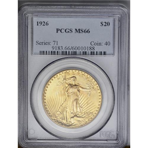 <B>1926<$20> MS66 PCGS.</B></I> This is a wonderful Premium Gem with highly lustrous apricot-gold surfaces imbued with lime-green toning. The surfaces are nearly perfect on the obverse, with a few wispy marks on the reverse and a slightly more noticeable abrasion on the sun. It is sharply struck and most attractive, a true prize for the connoisseur.<BR><I>From The Jackson Hole Collection.</B></I>