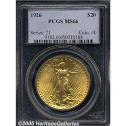 <B>1926 $20 MS66 PCGS.</B></I> This is a wonderful Gem with highly lustrous yellow-gold color and hints of orange toning. The surfaces are nearly perfect. It is sharply struck and most attractive, a prize for the connoisseur.