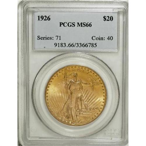 <B>1926 $20 MS66 PCGS.</B></I> Intense cartwheel luster and exceptionally clean surfaces allow this piece to easily qualify for the lofty Premium Gem grade. The strike is unusually sharp, and some minor shelf doubling is detected on the digits of the date under close examination. An especially attractive specimen.<BR><BR><B>Coin Engraver:</B> Augustus Saint-Gaudens<BR><BR><b>Shipping:</b> Coins & Currency (<a target="_blank" href="http://www.heritageauctions.com/common/shipping.php">view shipping information</a>)