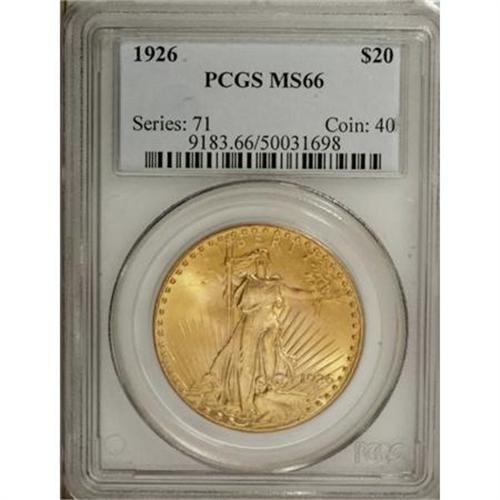 <B>1926 $20 MS66 PCGS.</B></I> A lovely survivor with exceptionally clean fields. The color is a rich, baroque-gold and the strike is bold. Only a cluster of light marks on Liberty's chest and some light rim chatter at 8 o'clock on the reverse preclude a Superb Gem grade, of which PCGS has graded only three (12/07). <BR><BR><B>Coin Engraver:</B> Augustus Saint-Gaudens<BR><BR><b>Shipping:</b> Coins & Currency (<a target="_blank" href="http://www.heritageauctions.com/common/shipping.php">view shipping information</a>)