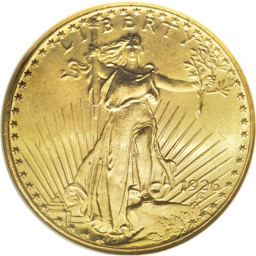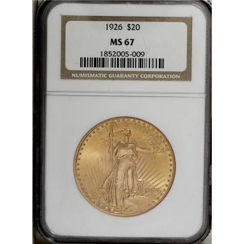 <B>1926 $20 MS67 NGC.</B></I> Jeff Garrett and Ron Guth, in their 2006 <I>Encyclopedia of U.S. Gold Coins, 1795-1933, </B></I> write that: "Like most other Philadelphia issues from this period, a significant number were saved in European banks and have since made their way back home. As a date, this is one of the most common issues in the series, ranking number 48 of the 54 dates and mints." The 1926 in Uncirculated condition is readily available through MS65, as is evidenced by the several thousand that have been certified by NGC and PCGS. In the lofty grade of MS67, a mere eight pieces have been graded, and none finer.<BR> Potent luster radiates from both sides of this apricot-gold Superb Gem. The boldly executed strike manifests itself in sharp definition on Liberty's face, fingers, and toes, as well as on the olive branch and the eagle's feathers. The surfaces are well preserved throughout; the few minute marks on Liberty's upper right (left facing) leg may help to pedigree this example. Census: 5 in 67, 0 finer (10/06).<BR><BR><b>Shipping:</b> Coin/Currency (<a target="_blank" href="http://www.heritageauctions.com/common/shipping.php">view shipping information</a>)