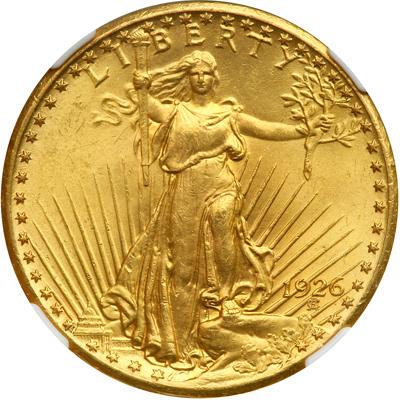 1926 $20 St. Gaudens. NGC graded MS-64 PQ. Delicate golden toning. A Premium Coin for the grade due to its eye appeal and overall excellent luster (PCGS # 9183) .