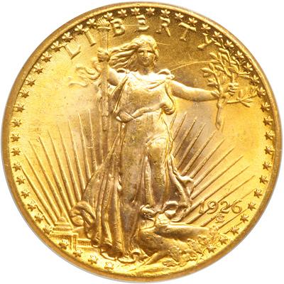 1926 $20 St. Gaudens. PCGS graded MS-63. Captivating sunset golden toning graces both sides. Fantastic lustrous surfaces (PCGS # 9183) .