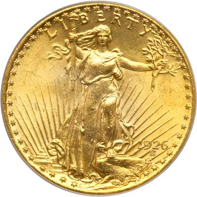 1926 $20 St. Gaudens. PCGS graded MS-64. Attractive flashy golden toning on both sides, well up there in terms of fresh detail and luster originality (PCGS # 9183) .