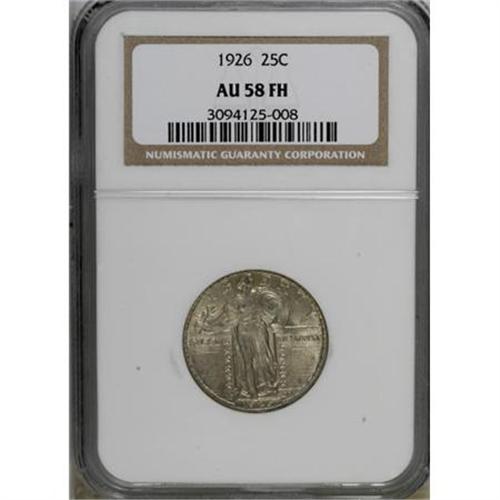 <B>1926 25C AU58 Full Head NGC.</B></I> NGC Census: (12/231). PCGS Population (19/340). Mintage: 11,316,000. Numismedia Wsl. Price for NGC/PCGS coin in AU58: $100. (#5755)<BR><BR><B>Coin Engraver:</B> Hermon A. MacNeil<BR><BR><b>Shipping:</b> Coins & Currency (<a target="_blank" href="http://www.heritageauctions.com/common/shipping.php">view shipping information</a>)