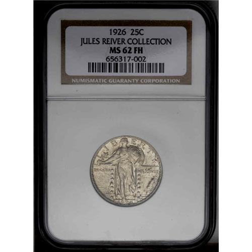 <B>1926<25C> MS62 Full Head NGC.</B></I> Sharply struck and lightly toned with few post-striking impairments. The satiny surfaces are free of contact marks, and show scattered charcoal-brown mottling on both sides, which is noticeable mainly on the upper half of the reverse. A pleasing Full Head example.