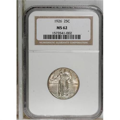 <B>1926 25C MS62 NGC.</B></I> NGC Census: (69/461). PCGS Population (84/609). Mintage: 11,316,000. Numismedia Wsl. Price for NGC/PCGS coin in MS62: $125. (#5754)<BR><BR><b>Shipping:</b> Coins & Currency (<a target="_blank" href="http://www.heritageauctions.com/common/shipping.php">view shipping information</a>)