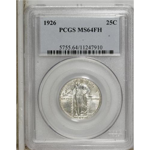 <B>1926 25C MS64 Full Head PCGS.</B></I> Choice and solidly struck with strongly lustrous silver-white surfaces. A touch of softness visits the shield, and a few too many marks appear on each side for this coin to merit a Gem grade.<BR><BR><b>Shipping:</b> Coins & Currency (<a target="_blank" href="http://www.heritageauctions.com/common/shipping.php">view shipping information</a>)