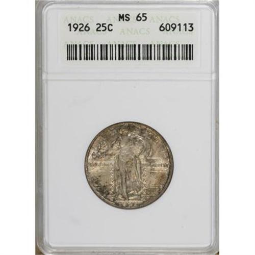 <B>1926 25C MS65 ANACS.</B></I> NGC Census: (106/25). PCGS Population (120/29). Mintage: 11,316,000. Numismedia Wsl. Price for NGC/PCGS coin in MS65: $480. (#5754)<BR><BR><B>Coin Engraver:</B> Hermon A. MacNeil<BR><BR><b>Shipping:</b> Coins & Currency (<a target="_blank" href="http://www.heritageauctions.com/common/shipping.php">view shipping information</a>\)