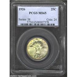 1926 25C MS65 PCGS. Original yellow-gold patina fills the reverse periphery and most of the left sid