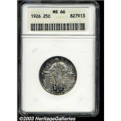 1926 25C MS66 ANACS. Deep, mottled russet-brown and charcoal toning accent each side. Well defined, although not quite full, with no mentionable marks. Important notice: Heritage usually auctions material at the rate of 200-250 lots per hour. On some occasions eBay Live bid software or the Internet may not be able to keep up with the pace of the auction. We recommend placing a realistic absentee bid now as insurance to avoid disappointment. Occasionally the auctioneer may eliminate or reject an eBay Live bid, and the auctioneer may also reopen a lot after the close of the eBay live bidding (usually because we missed an audience bid), and may reject your bid even if it shows you as the winning bidder. By bidding via eBay Live, you agree that Heritage may award the lot to another bidder at its sole discretion under the circumstances described above or any other reasonable circumstances. Also please note that all Heritage lots purchased through eBay Live carry a 20% Buyer's Premium. Please make sure you read the Terms and Conditions before you bid.