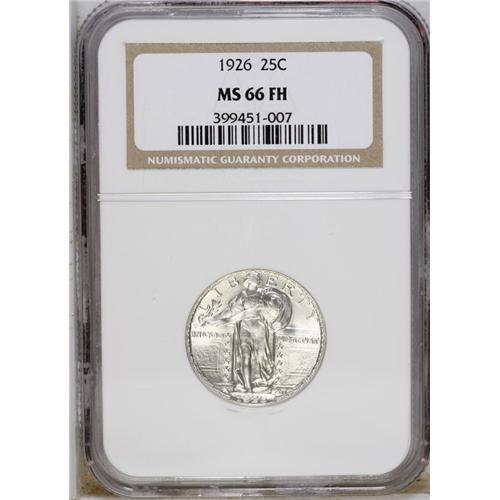 <B>1926 25C MS66 Full Head NGC.</B></I> Untoned with outstanding sharpness and dynamic luster that bursts forth from each side. These superlatives are further enhanced by impeccable surface quality that really sets this piece apart from the typical Mint State survivor. Census: 14 in 66, 2 finer (12/06).<BR><BR><b>Shipping:</b> Coin/Currency (<a target="_blank" href="http://www.heritageauctions.com/common/shipping.php">view shipping information</a>)