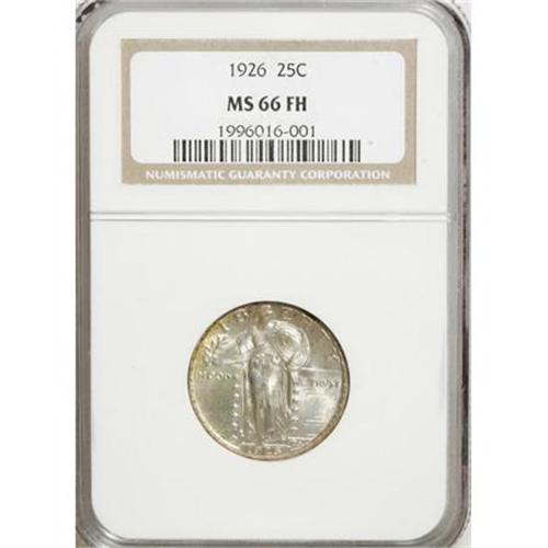 <B>1926 25C MS66 Full Head NGC.</B></I> Well struck for an issue than often comes weakly defined. Both sides are awash in glowing luster, and display whispers of golden-tan, green, and rose patination along portions of the margins. Impeccable preservation is noted throughout. Census: 17 in 66 Full Head, 2 finer (11/07).<BR><I>From The Hoffy Collection, NGC's #3 Registry Collection of Standing Liberty Quarters.</B></I><BR><BR><B>Coin Engraver:</B> Hermon A. MacNeil<BR><BR><b>Shipping:</b> Coins & Currency (<a target="_blank" href="http://www.heritageauctions.com/common/shipping.php">view shipping information</a>)