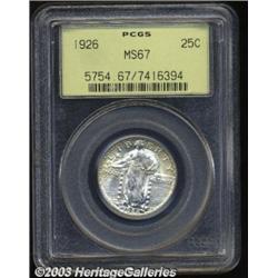 1926 25C MS67 PCGS. A faint splash of pastel colors adorns the upper obverse, while the remaining surfaces are bright, highly lustrous, and exquisitely preserved. Well struck, with only minor weakness on the center of Liberty's head, and very sharp details on the reverse. A small graze in the left obverse field is the only slight distraction. An exceptionally attractive Superb Gem. Important notice: Heritage usually auctions material at the rate of 200-250 lots per hour. On some occasions eBay Live bid software or the Internet may not be able to keep up with the pace of the auction. We recommend placing a realistic absentee bid now as insurance to avoid disappointment. Occasionally the auctioneer may eliminate or reject an eBay Live bid, and the auctioneer may also reopen a lot after the close of the eBay live bidding (usually because we missed an audience bid), and may reject your bid even if it shows you as the winning bidder. By bidding via eBay Live, you agree that Heritage may award the lot to another bidder at its sole discretion under the circumstances described above or any other reasonable circumstances. Also please note that all Heritage lots purchased through eBay Live carry a 20% Buyer's Premium. Please make sure you read the Terms and Conditions before you bid.