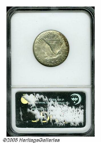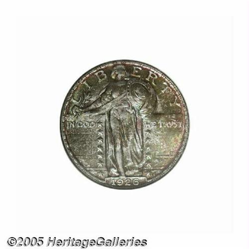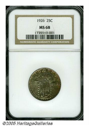 <B>1926<25C> MS68 NGC.</B></I> A spectacular Gem example of the variety, and certainly among the very finest in existence for the issue! The obverse has warm gunmetal gray toning with navy blue, russet, and pink iridescent highlights. The reverse is mostly brilliant with blushes and splashes of pale gold and charcoal gray. The toning is consistent with what we might expect when a coin is at either end of an original mint roll that was opened after many years. Although the 1926 is not a particularly rare date, the piece offered here is of great importance by merit of its extraordinary condition. Only a tiny portion of the mintage could possibly remain this beautifully preserved, a claim that is readily attested by the NGC Census information presented below. We expect many generous bids when this beauty crosses the auction block! Population: 2 in 68, 0 finer (6/05).