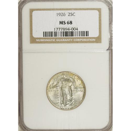 <B>1926 25C MS68 NGC.</B></I> One of the two finest known at either service, the present example boasts a luscious, lightly patinated obverse in apricot-gold and jade-green hues, with a brilliant reverse. A just-miss Full Head coin, lacking that designation only because not much of the ear hole is visible, and only two of the three olive sprigs. Even close scrutiny with a loupe fails to reveal any mentionable abrasions, large or small. All of the shield rivets are present, but none of the shield lines are visible. Bold luster emanates from each side of this beautiful and unimprovable specimen. Census: 2 in 68, 0 finer (4/07).<BR><BR><b>Shipping:</b> Coins & Currency (<a target="_blank" href="http://www.heritageauctions.com/common/shipping.php">view shipping information</a>)