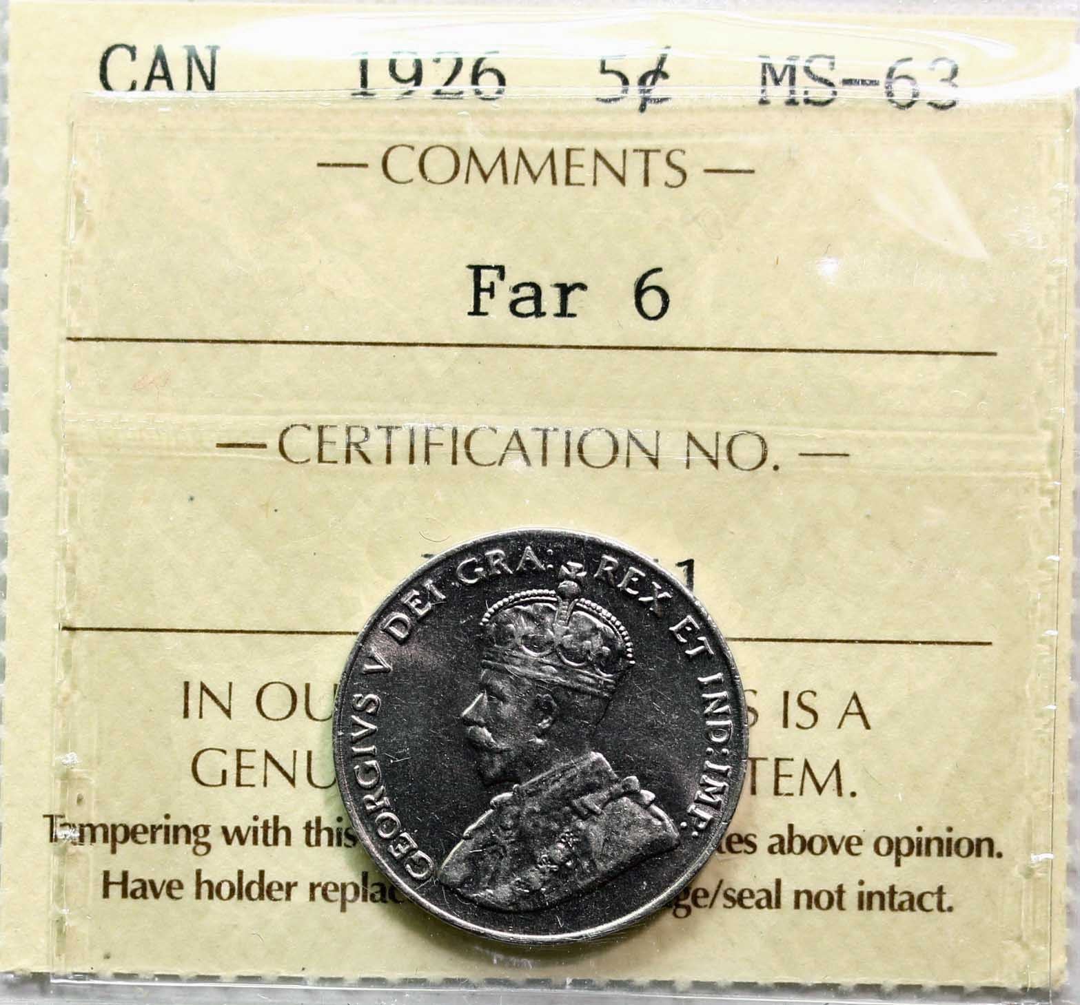1926 5¢ "Far 6" ICCS Choice Mint State-63. A highly attractive and beautiful variety to add to your collection. A perfect opportunity to acquire this wonderful example! It displays great fields with superb cartwheel luster and nice surfaces. Amongst the best we have offered and sure to excite the collector who has been holding out for a superb example.