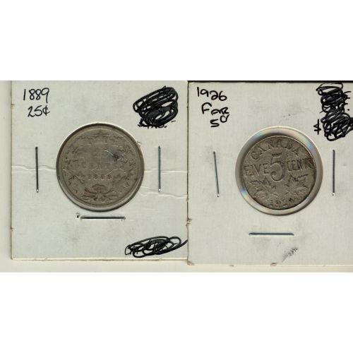 1926 5¢ Far 6 and 1889 25¢. Lot of 2 key date coins both with problems. G to Fine.