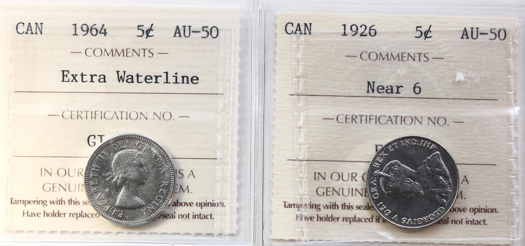 1926 5¢ "Near 6", 1964 "Extra Waterline". Both coins About Uncirculated-50