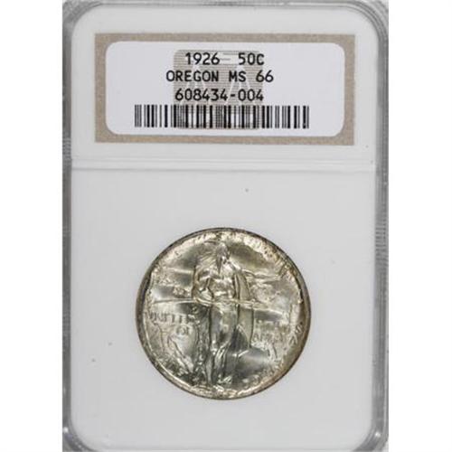 <B>1926 50C Oregon MS66 NGC.</B></I> NGC Census: (286/42). PCGS Population (291/56). Mintage: 47,955. Numismedia Wsl. Price for NGC/PCGS coin in MS66: $420. (#9340)<BR><BR><b>Shipping:</b> Coins & Currency (<a target="_blank" href="http://www.heritageauctions.com/common/shipping.php">view shipping information</a>)