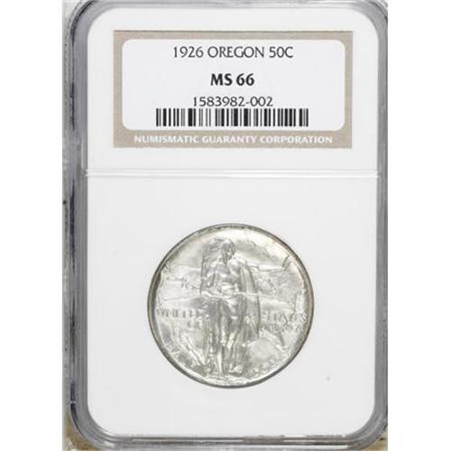 <B>1926 50C Oregon MS66 NGC.</B></I> . NGC Census: (292/43). PCGS Population (305/56). Mintage: 47,955. Numismedia Wsl. Price for NGC/PCGS coin in MS66: $420. (#9340)<BR><BR><b>Shipping:</b> Coins & Currency (<a target="_blank" href="http://www.heritageauctions.com/common/shipping.php">view shipping information</a>)