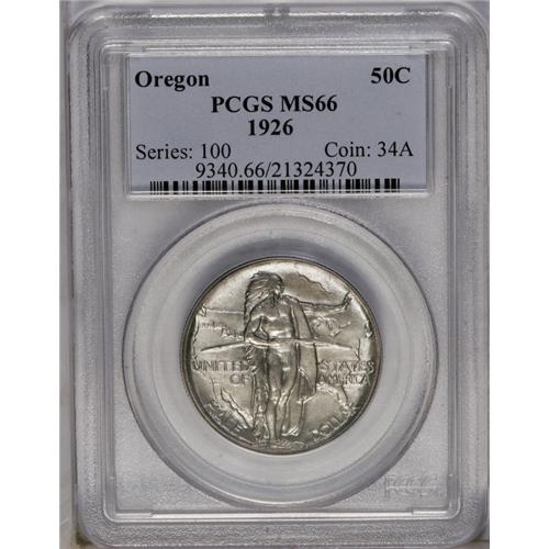 <B>1926<50C> Oregon MS66 PCGS.</B></I> A razor-sharp Gem with medium apricot-gray patina and moderate cartwheel luster. A well preserved representative of this popular type from the inaugural year of its issue.