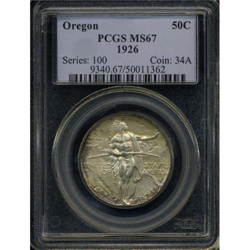 <B>1926<50C> Oregon MS67 PCGS.</B></I> Boldly defined and fully lustrous with a light spray of tan patina highlighted by small patches of darker russet peripheral toning. Population: 47 in 67, 3 finer (3/06).