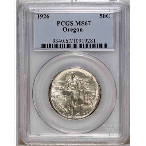 <B>1926 50C Oregon MS67 PCGS.</B></I> This issue sports the second-highest mintage in the 13-year history of this commemorative series-within-a-series. Highly lustrous with light gold and blue patina on the obverse and dots of violet-charcoal on the reverse. Population: 50 in 67, 3 finer (12/06).<BR><BR><b>Shipping:</b> Coin/Currency (<a target="_blank" href="http://www.heritageauctions.com/common/shipping.php">view shipping information</a>)