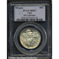 <B>1926<50C> Oregon MS67 PCGS.</B></I> Fully struck and seemingly pristine, with splendid satiny luster and creamy, lightly toned surfaces. One of the finest known examples of this popular commemorative issue, and a marvelously preserved, truly beautiful Superb Gem. Population: 36 in 67, 0 finer (3/04).<BR><I>Ex: Long Beach Signature Sale (Heritage, 2/02), lot 6352, which realized $2,530.</B></I><BR><I>From the JFS Collection, the #1 All-Time PCGS Registry Set.</B></I> <BR><BR><B>Important notice:</B> Heritage usually auctions material at the rate of 200-250 lots per hour. On some occasions eBay Live bid software or the Internet may not be able to keep up with the pace of the auction. We recommend placing a realistic absentee bid now as insurance to avoid disappointment. Occasionally the auctioneer may eliminate or reject an eBay Live bid, and the auctioneer may also reopen a lot after the close of the eBay live bidding (usually because we missed an audience bid), and may reject your bid even if it shows you as the winning bidder. By bidding via eBay Live, you agree that Heritage may award the lot to another bidder at its sole discretion under the circumstances described above or any other reasonable circumstances. Since eBay bids are not shown to us until we open the lot on the floor, we treat those bids just like floor bids. In most cases the floor responds before the eBay bid is presented to us, due to Internet lag time, so for consistency we have made it a policy that floor bids are always considered first over tie eBay live bids. Also please note that all Heritage lots purchased through eBay Live carry a 20% Buyer's Premium. Please make sure you read the Terms and Conditions before you bid. </span></font></tr></table></td></tr></table>