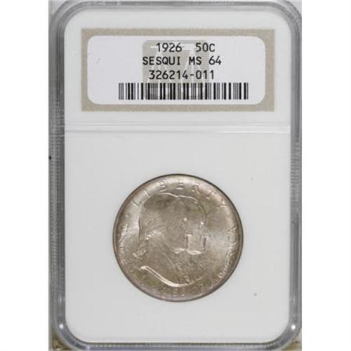 <B>1926 50C Sesquicentennial MS64 NGC.</B></I> . NGC Census: (1663/257). PCGS Population (1880/227). Mintage: 141,120. Numismedia Wsl. Price for NGC/PCGS coin in MS64: $440. (#9374)<BR><BR><b>Shipping:</b> Coins & Currency (<a target="_blank" href="http://www.heritageauctions.com/common/shipping.php">view shipping information</a>)