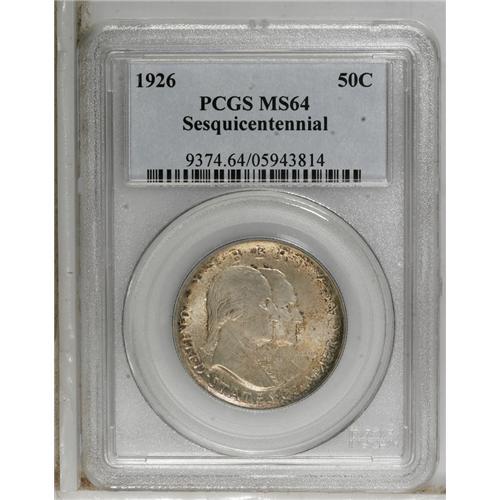 <B>1926 50C Sesquicentennial MS64 PCGS.</B></I> Gold-gray overall with speckled russet toning at the periphery. Luminous and well struck with surprisingly few marks for the grade, though a handful of wispy abrasions deny the Gem status that is so elusive for this low-relief issue.<BR><BR><b>Shipping:</b> Coins & Currency (<a target="_blank" href="http://www.heritageauctions.com/common/shipping.php">view shipping information</a>)