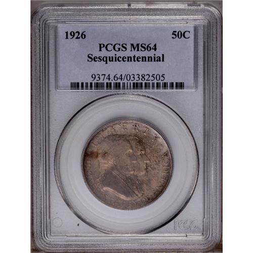 <B>1926<50C> Sesquicentennial MS64 PCGS.</B></I> Rose and olive envelopes both sides. Inspection with a loupe confirms near-Gem quality. <BR><BR><B>Important notice:</B> Heritage usually auctions material at the rate of 200-250 lots per hour. On some occasions eBay Live bid software or the Internet may not be able to keep up with the pace of the auction. We recommend placing a realistic absentee bid now as insurance to avoid disappointment. Occasionally the auctioneer may eliminate or reject an eBay Live bid, and the auctioneer may also reopen a lot after the close of the eBay live bidding (usually because we missed an audience bid), and may reject your bid even if it shows you as the winning bidder. By bidding via eBay Live, you agree that Heritage may award the lot to another bidder at its sole discretion under the circumstances described above or any other reasonable circumstances. Since eBay bids are not shown to us until we open the lot on the floor, we treat those bids just like floor bids. In most cases the floor responds before the eBay bid is presented to us, due to Internet lag time, so for consistency we have made it a policy that floor bids are always considered first over tie eBay live bids. Also please note that all Heritage lots purchased through eBay Live carry a 20% Buyer's Premium. Please make sure you read the Terms and Conditions before you bid. This lot is being auctioned in conjunction with a live floor auction by Heritage Galleries & Auctioneers. All final auction and invoice information will be supplied by Heritage Galleries & Auctioneers, and all other information should be considered preliminary. Lot:5073 <BR><BR><B>Winning Notification and Billing:</B> After the FINAL session in this auction is complete, Heritage will send e-mail and snail mail invoices. This process normally takes several days. All final auction and invoice information will be supplied by Heritage Galleries & Auctioneers, and all other information should be considered preliminary. <BR><BR>This auction will be conducted on a live auction floor and over the Internet through eBay Live. If you choose to place an absentee bid, please take a moment to <font color='#0000ff'><u><a href='http://pages.ebay.com/liveauctions/help/before/laabsentee.html'>learn how eBay Live absentee bidding works</a></u></font><font color='#000000'>