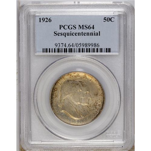 <B>1926 50C Sesquicentennial MS64 PCGS.</B></I> Speckles of russet dot golden-gray surfaces that exhibit sharply impressed design features. Both sides show pleasing luster, and reveal just a few unobtrusive marks.<BR><BR><b>Shipping:</b> Coin/Currency (<a target="_blank" href="http://www.heritageauctions.com/common/shipping.php">view shipping information</a>)