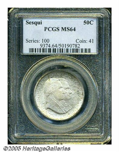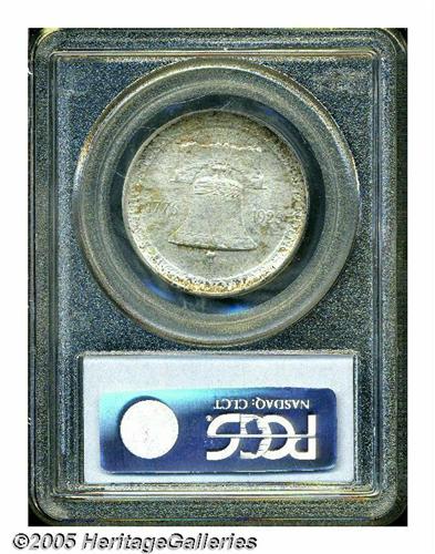 <B>1926<50C> Sesquicentennial MS64 PCGS.</B></I> Streaky milky-gray patina combines with a few splashes of light golden-brown color to rest over lustrous surfaces. The design features are well struck, and a few minute marks on the cheeks of the obverse portraits and on the bell define the grade.
