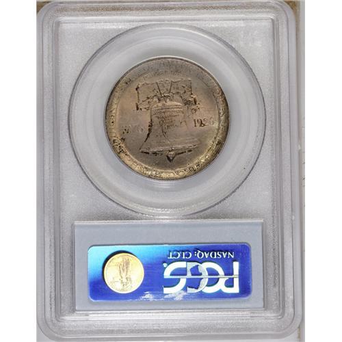 <B>1926 50C Sesquicentennial MS64 PCGS.</B></I> Strong luster explodes through faded rose and ice-blue patination, and sharp definition prevails on the design features. A couple of small milling marks on the reverse bell preclude an even higher grade.<BR><BR><b>Shipping:</b> Coin/Currency (<a target="_blank" href="http://www.heritageauctions.com/common/shipping.php">view shipping information</a>)