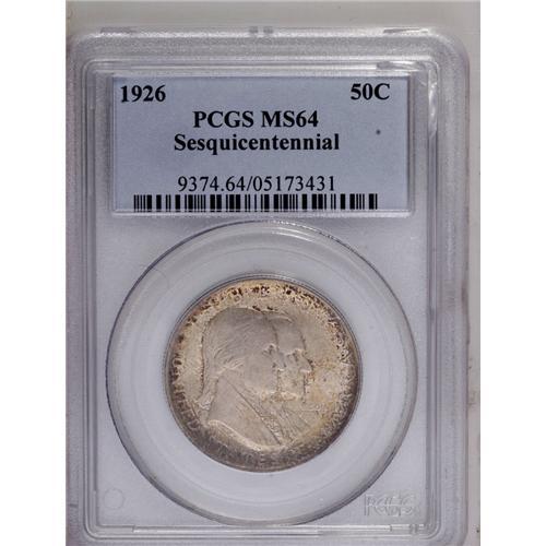 <B>1926<50C> Sesquicentennial MS64 PCGS.</B></I> Well struck with crisp details on the Liberty Bell, and pleasing satin luster. Lovely original patina occurs on each side in speckled variations of green, red, golden-brown, and russet. A small abrasion rests just below Washington's ear, and a couple of milling marks are noted on the reverse.