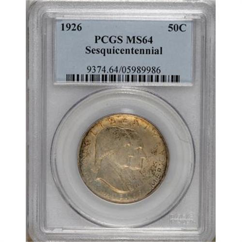 <B>1926 50C Sesquicentennial MS64 PCGS.</B></I> PCGS Population (1752/218). NGC Census: (1620/251). Mintage: 141,120. Numismedia Wsl. Price for NGC/PCGS coin in MS64: $460. (#9374)<BR><BR><b>Shipping:</b> Coins & Currency (<a target="_blank" href="http://www.heritageauctions.com/common/shipping.php">view shipping information</a>)