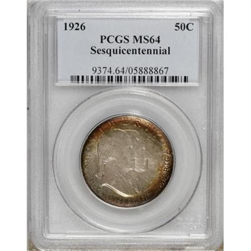 <B>1926 50C Sesquicentennial MS64 PCGS.</B></I> . PCGS Population (1874/226). NGC Census: (1663/257). Mintage: 141,120. Numismedia Wsl. Price for NGC/PCGS coin in MS64: $440. (#9374)<BR><BR><b>Shipping:</b> Coins & Currency (<a target="_blank" href="http://www.heritageauctions.com/common/shipping.php">view shipping information</a>)