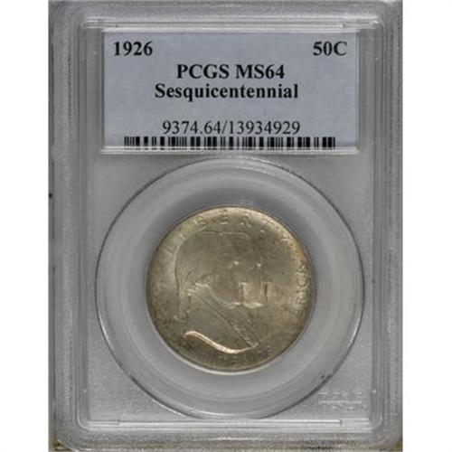 <B>1926 50C Sesquicentennial MS64 PCGS.</B></I> . PCGS Population (1874/226). NGC Census: (1663/257). Mintage: 141,120. Numismedia Wsl. Price for NGC/PCGS coin in MS64: $440. (#9374)<BR><BR><b>Shipping:</b> Coins & Currency (<a target="_blank" href="http://www.heritageauctions.com/common/shipping.php">view shipping information</a>)
