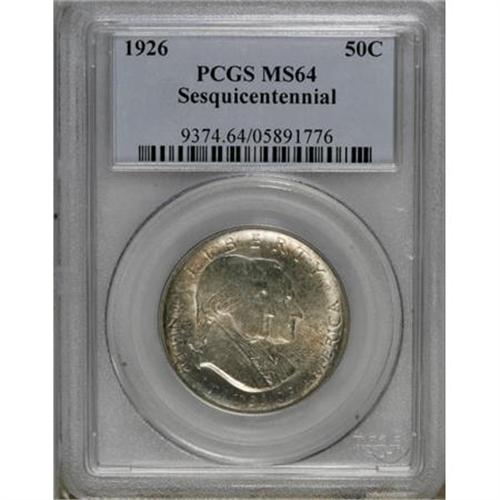 <B>1926 50C Sesquicentennial MS64 PCGS.</B></I> PCGS Population (1884/227). NGC Census: (1656/257). Mintage: 141,120. Numismedia Wsl. Price for NGC/PCGS coin in MS64: $440. (#9374)<BR><BR><b>Shipping:</b> Coins & Currency (<a target="_blank" href="http://www.heritageauctions.com/common/shipping.php">view shipping information</a>)