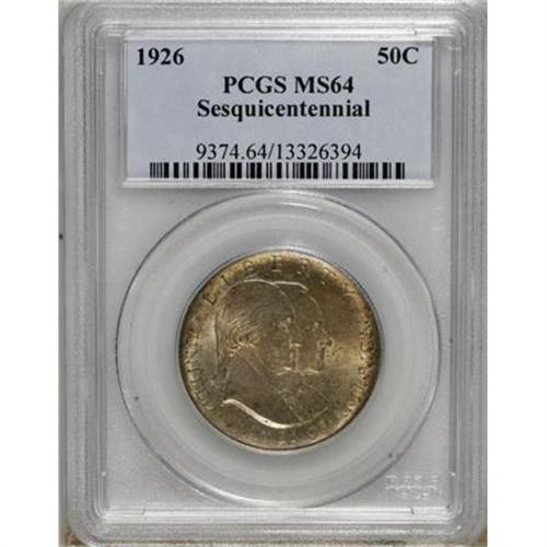 <B>1926 50C Sesquicentennial MS64 PCGS.</B></I> PCGS Population (1886/227). NGC Census: (1658/259). Mintage: 141,120. Numismedia Wsl. Price for NGC/PCGS coin in MS64: $440. (#9374)<BR><BR><b>Shipping:</b> Coins & Currency (<a target="_blank" href="http://www.heritageauctions.com/common/shipping.php">view shipping information</a>)