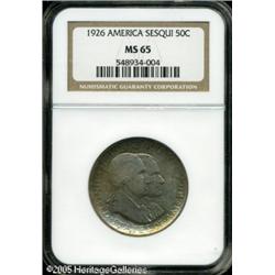<B>1926 50C Sesquicentennial MS65 NGC.</B></I> A lustrous lilac-gray example with a freckling of green-gold and orange toning advancing toward the margins. This issue's shallow relief and exposed design helps contribute to its difficulty as a Gem. Lot:8580