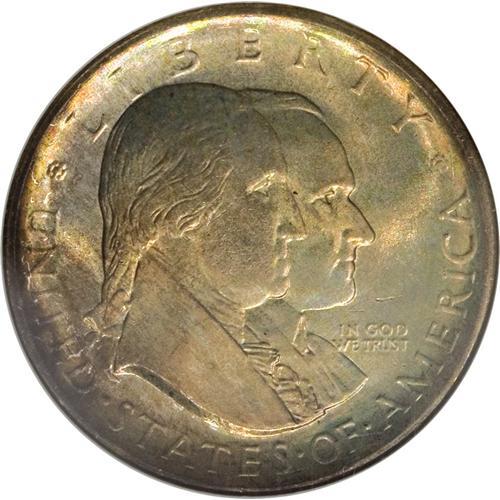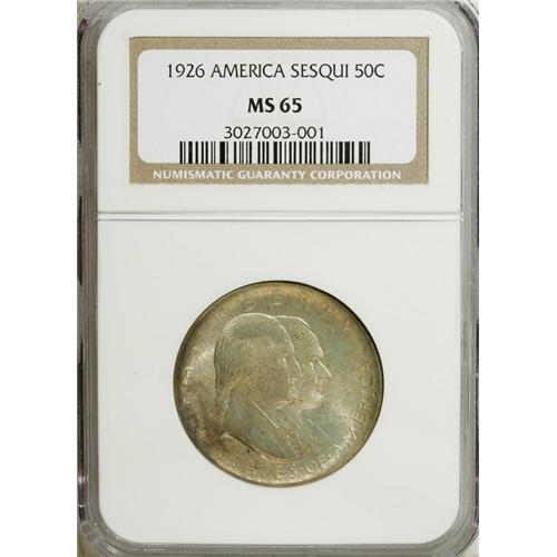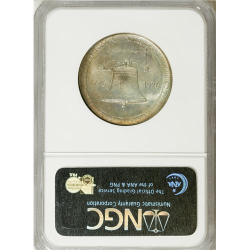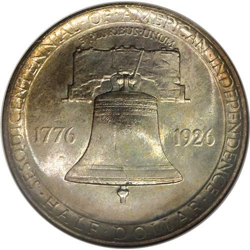 <B>1926 50C Sesquicentennial MS65 NGC.</B></I> A medley of orange-gold, lime-green, lavender, and sky-blue patination bathes highly lustrous surfaces. The strike is outstanding, imparting as it has bold definition to the design features. Close inspection reveals just a few minor marks, barely preventing the next grade level.<BR><BR><b>Shipping:</b> Coins & Currency (<a target="_blank" href="http://www.heritageauctions.com/common/shipping.php">view shipping information</a>)