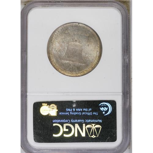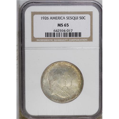 <B>1926<50C> Sesquicentennial MS65 NGC.</B></I> Although the production of 141,120 pieces makes this commemorative a common type in lower Uncirculated grades, it is a noted rarity as a Gem. The design has ample exposed fields, but the true grade-limiting factor is usually the low-relief design combined with the strike on Washington's cheek, which usually shows blemishes that were on the planchet before striking. While this moderately toned and lustrous example is not fully struck on the cheek, the definition is above average, and the surfaces are beautifully preserved. Both services combined have certified only 20 pieces finer (9/06).