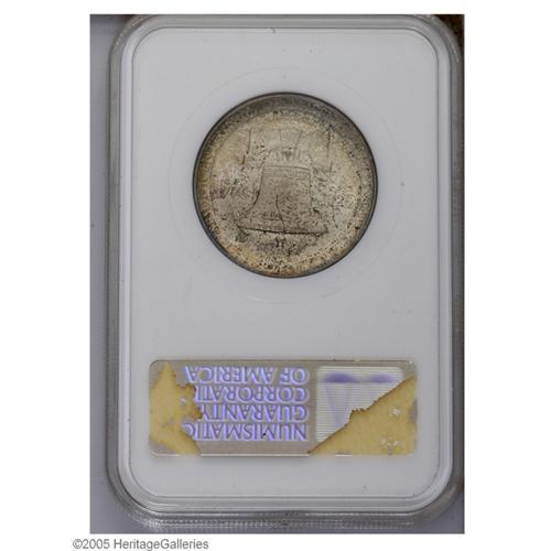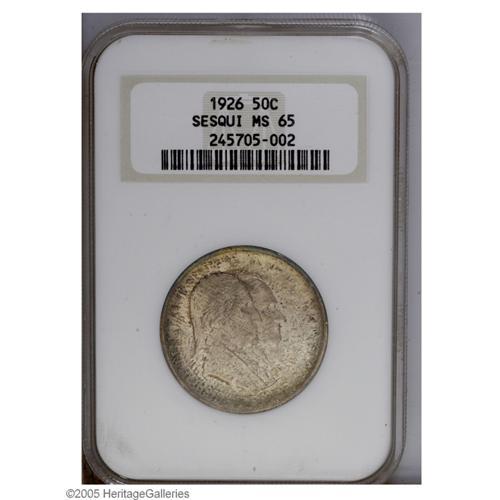 <B>1926<50C> Sesquicentennial MS65 NGC.</B></I> An original Gem with speckled russet and charcoal patina on each side, that yields to pale greenish iridescence toward the rims. It shows bright, satiny luster and displays only the smallest and most insignificant marks. This issue represents a key condition rarity among commemorative halves, with relatively few graded at MS65, considering the rather hefty original mintage of 141,120. Population: 191 in 65, 11 finer (10/05).