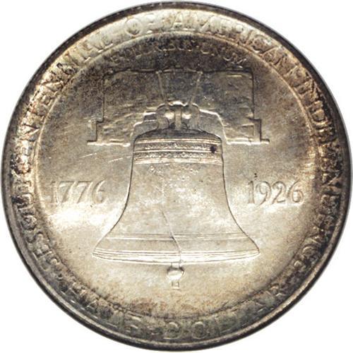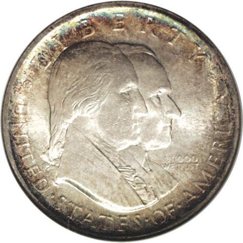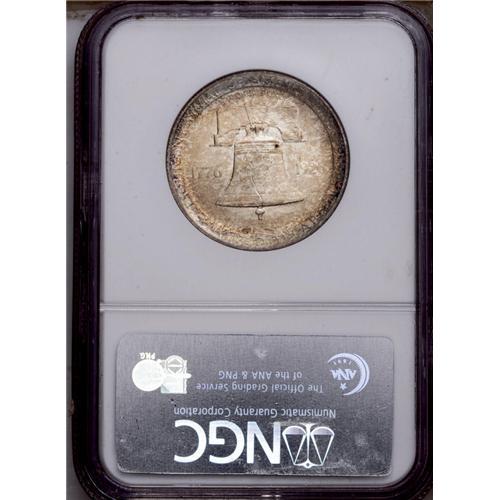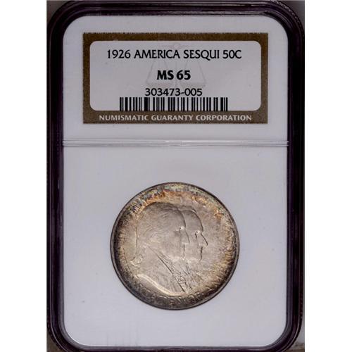 <B>1926<50C> Sesquicentennial MS65 NGC.</B></I> Bright luster emanates from surfaces lightly toned in cobalt-blue, lavender, and golden-brown around the peripheral areas, while dapples of light gold-tan travel to the centers. Some softness is noted on portions of the central devices. A handful of minute contact marks occur on Washington's face and on the Liberty Bell.