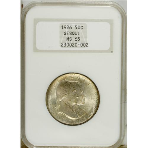 <B>1926 50C Sesquicentennial MS65 NGC.</B></I> Lustrous for the issue with lightly toned surfaces and a decent strike. Only a few original planchet flaws are visible on the portrait's cheek. Soft shades of gray-lilac and golden-brown are seen in a somewhat mottled fashion over each side. Housed in an older generation NGC holder. The sole appearance for Calvin Coolidge on a U.S. coin issue, although his turn will eventually come on the Presidential golden dollar series.<BR><BR><b>Shipping:</b> Coins & Currency (<a target="_blank" href="http://www.heritageauctions.com/common/shipping.php">view shipping information</a>)
