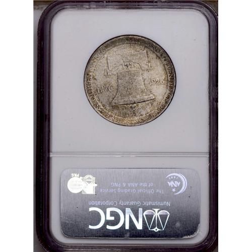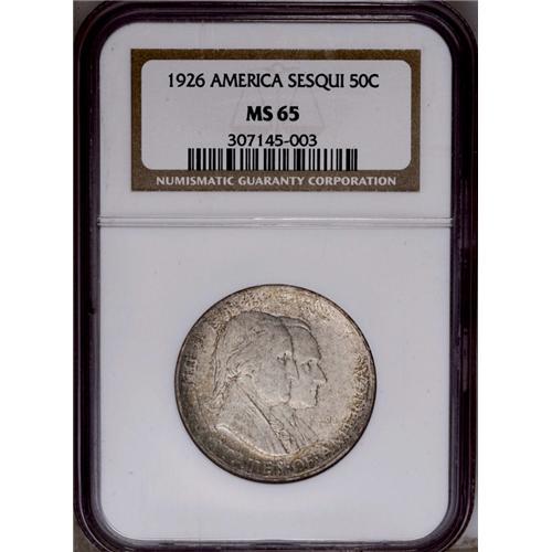 <B>1926<50C> Sesquicentennial MS65 NGC.</B></I> This Gem Sesqui commemorative displays dappled olive-green patination that is slightly more prominent in the border areas. The design features are generally well impressed, though portions of Washington's hair and the bell lettering are soft. A few small marks scattered over Washington's face and the obverse rim are mentioned for accuracy.