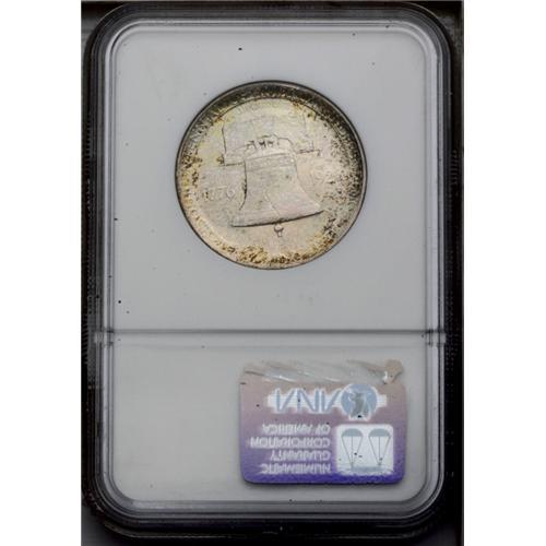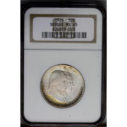 <B>1926<50C> Sesquicentennial MS65 NGC.</B></I> This bright, lustrous coin is much more eye-appealing than the typically seen Sesquicentennial. Each side is toned a light aqua-blue, with deeper amber-gold iridescence at the rims. This issue is one of the great condition rarities in the commemorative series, rarely seen in Gem condition. NGC has graded 11 finer (3/06). <BR><BR><B>Important notice:</B> Heritage usually auctions material at the rate of 200-250 lots per hour. On some occasions eBay Live bid software or the Internet may not be able to keep up with the pace of the auction. We recommend placing a realistic absentee bid now as insurance to avoid disappointment. Occasionally the auctioneer may eliminate or reject an eBay Live bid, and the auctioneer may also reopen a lot after the close of the eBay live bidding (usually because we missed an audience bid), and may reject your bid even if it shows you as the winning bidder. By bidding via eBay Live, you agree that Heritage may award the lot to another bidder at its sole discretion under the circumstances described above or any other reasonable circumstances. Since eBay bids are not shown to us until we open the lot on the floor, we treat those bids just like floor bids. In most cases the floor responds before the eBay bid is presented to us, due to Internet lag time, so for consistency we have made it a policy that floor bids are always considered first over tie eBay live bids. Also please note that all Heritage lots purchased through eBay Live carry a 20% Buyer's Premium. Please make sure you read the Terms and Conditions before you bid. This lot is being auctioned in conjunction with a live floor auction by Heritage Galleries & Auctioneers. All final auction and invoice information will be supplied by Heritage Galleries & Auctioneers, and all other information should be considered preliminary. Lot:5079 <BR><BR><B>Winning Notification and Billing:</B> After the FINAL session in this auction is complete, Heritage will send e-mail and snail mail invoices. This process normally takes several days. All final auction and invoice information will be supplied by Heritage Galleries & Auctioneers, and all other information should be considered preliminary. <BR><BR>This auction will be conducted on a live auction floor and over the Internet through eBay Live. If you choose to place an absentee bid, please take a moment to <font color='#0000ff'><u><a href='http://pages.ebay.com/liveauctions/help/before/laabsentee.html'>learn how eBay Live absentee bidding works</a></u></font><font color='#000000'>