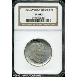 <B>1926 50C Sesquicentennial MS65 NGC.</B></I> Well defined for this often substandard commemorative, with appealing golden and blue pastel toning. A darker, squiggly streak of toning through BE of LIBERTY stands out above the portraits. Lot:8581